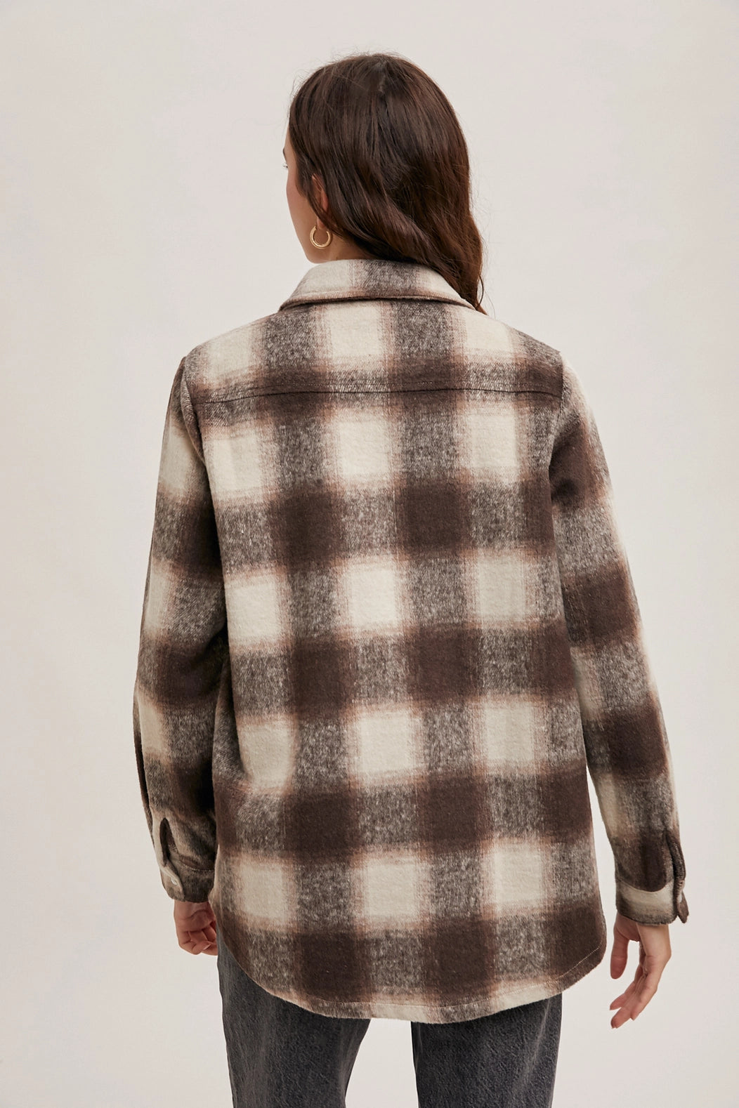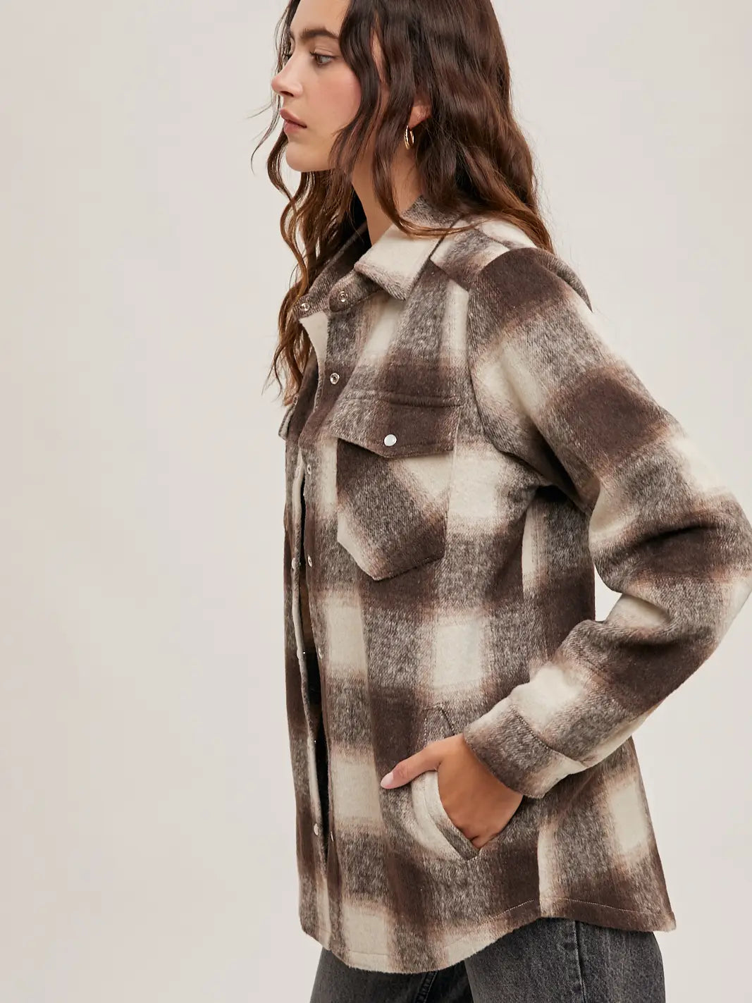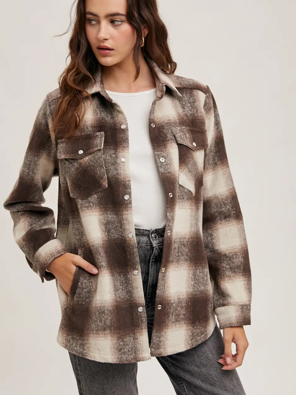 Button down flannel shacket with pockets. This versatile piece combines the comfort of a shirt with the warmth of a jacket, perfect for layering in cooler weather. The flannel fabric offers a cozy feel, while the button-down front and practical pockets add functionality. Ideal for casual outings and outdoor activities.
